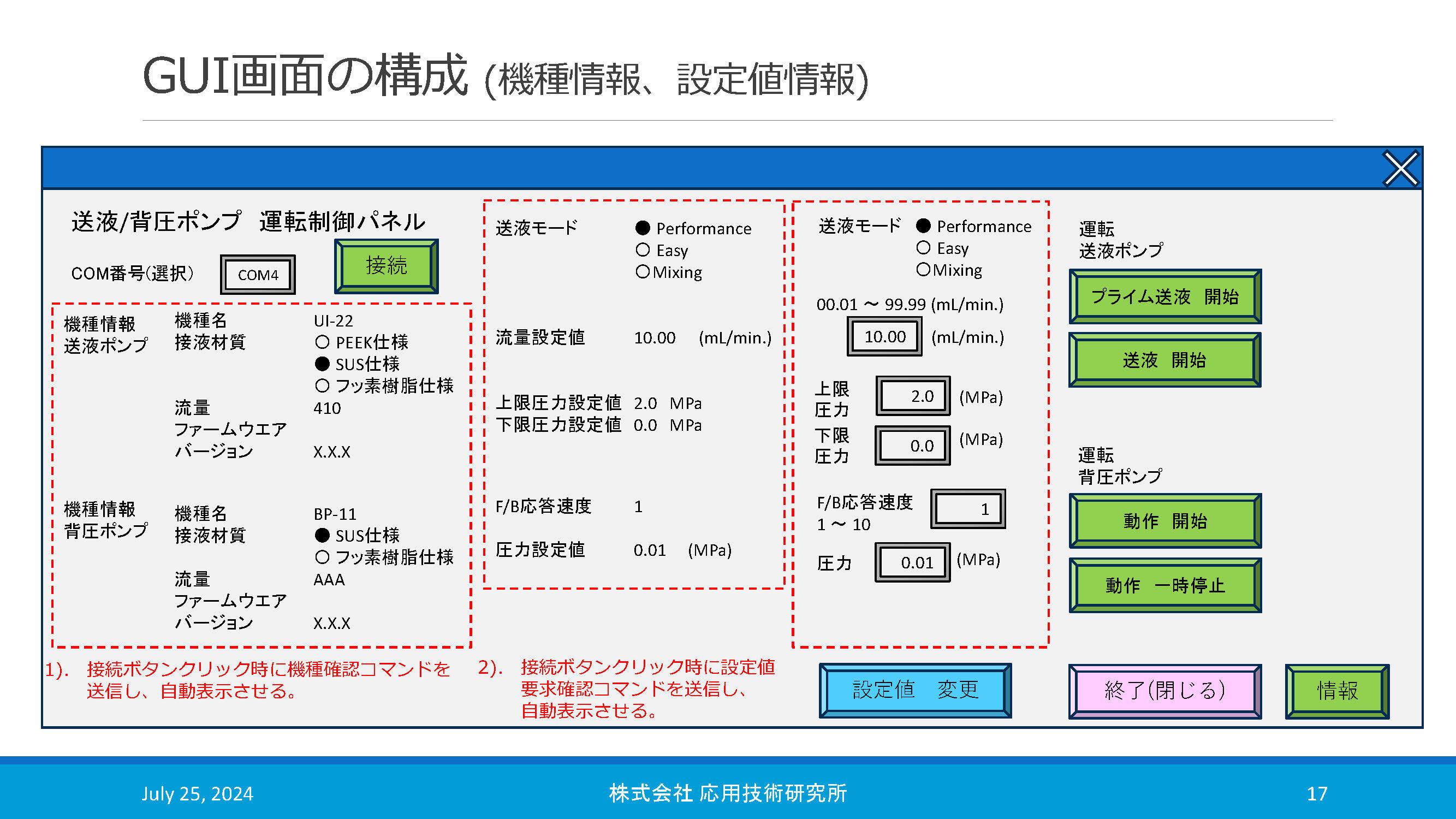 インテリジェントポンプ(UI-22)とUI-22シリーズ用自動圧力調整装置(Auto BPR)をシリアル通信(RS232C / RS485)を介し、パソコンからの遠隔操作を可能にするソフトウエア(GUI画面)です。